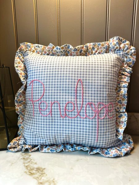 This unique personalised cushion is made from soft 100% cotton with reversible prints and beautiful custom hand embroidered name.