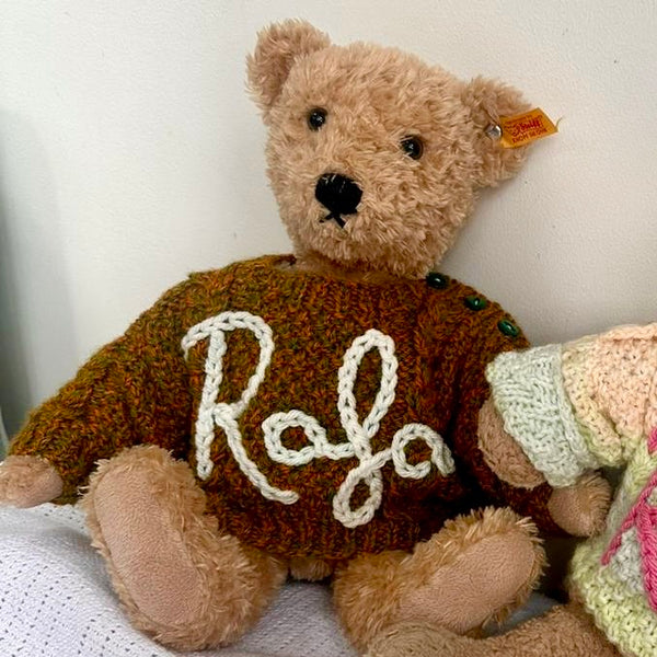Our teddy personalised hand knitted jumpers are the perfect little childhood or newborn keepsake and can be customised with any name or word you would like up to 4 letters. (They are too small for anymore letters unfortunately but initials and shorter nicknames work well.)